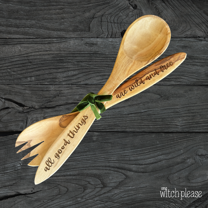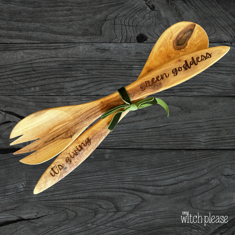 Olivewood, made in Italy, and laser engraved by me. You'll get the set of spoon and fork for tossing salad, serving greens, anything you're god/dess heart desires.